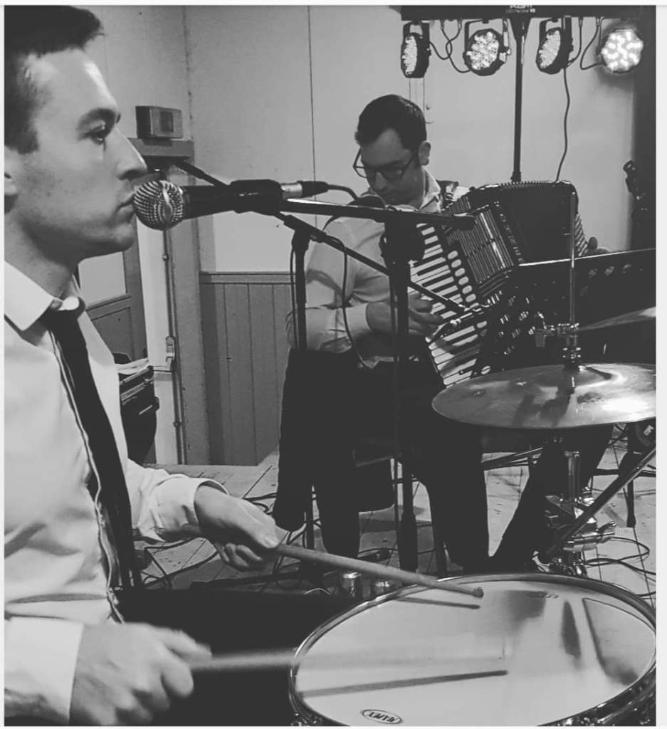 David will bring radio mics and do the calling on the dance floor if needed or work from the stage if it seems more appropriate. As well as talking through dances beforehand we also keep an eye on dancers and can continue calling while playing if needed.