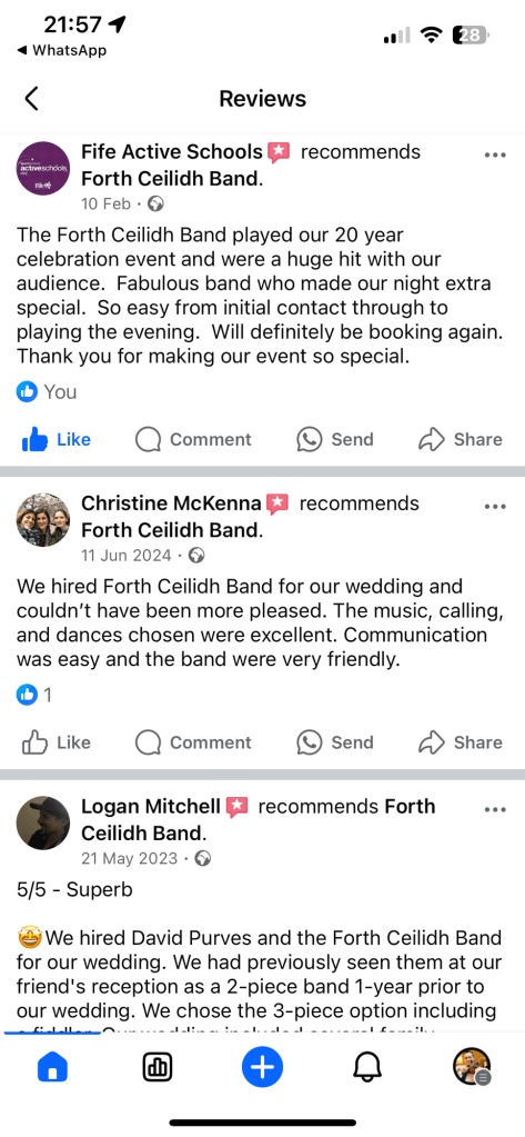 Forth Ceilidh band were fantastic at our event! 55 guest well enjoyed the dancing, and about 40 of us were taught the dances as we went through them, thank you very much to the band for leading us through it all! They would be my first pick if I was throwing another ceilidh and I’ll definitely be recommending to others if they need 🙂