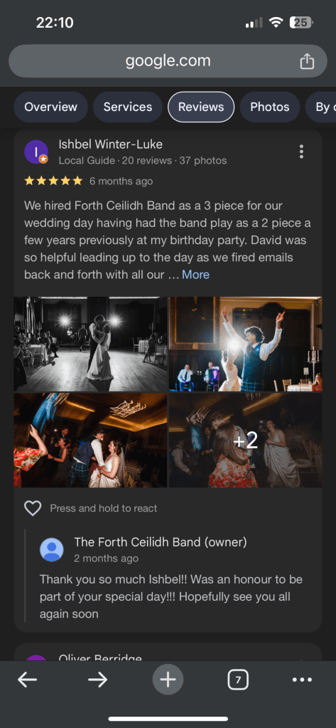 Excellent ceilidh from the band, very professional on the mic, and performed a solid set of classic dances for us and our guests, as well as encouraging others to join midway through the first dance. Thanks again guys!
